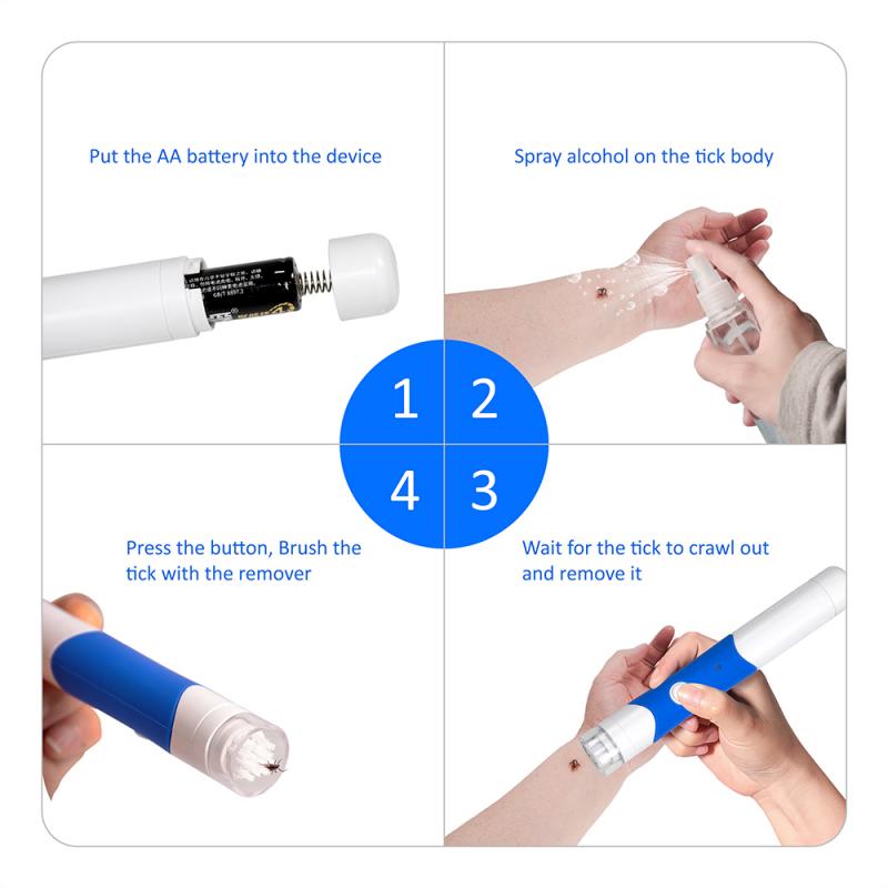 Spray alcohol on the tick body, after 10 minutes, brush it with the remover. Brushing modes: Mode 1: Continue brushing: press the button for one time after powered on, the brush will keep brushing. Mode 2: Altemate brushing (altemate 3 seconds working with 1 second stop): press the button for one time under mode 1. |